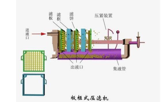 上图是板框式压滤机结构图,如图我们所示,料液从上方进入,流入滤框,一个滤框有两个滤板,料液通过两个滤板后,滤饼留着两个滤板夹着的滤框内,滤液从下方的出液管出去。